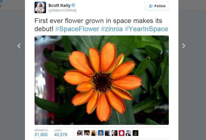 O astronauta americano Scott Kelly celebrou o feito no Twitter com uma mensagem na qual comemorava "a estreia da primeira flor nascida no espaço".